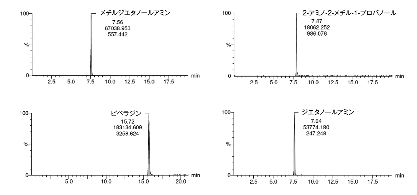 になります。全て異なるアミンですが、ピーク形状と分離は良好で、問題なく測定出来ました。