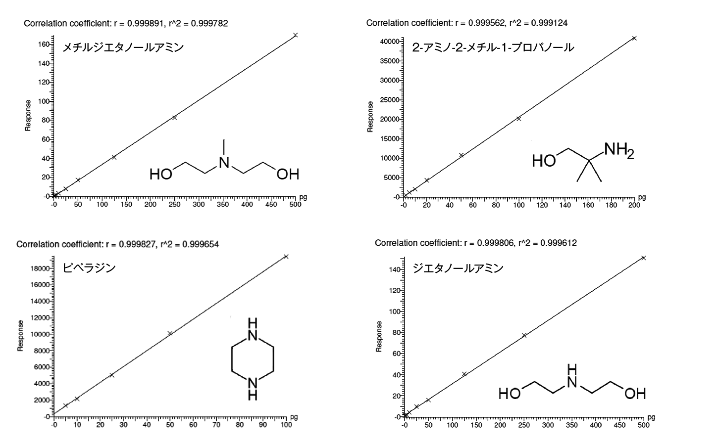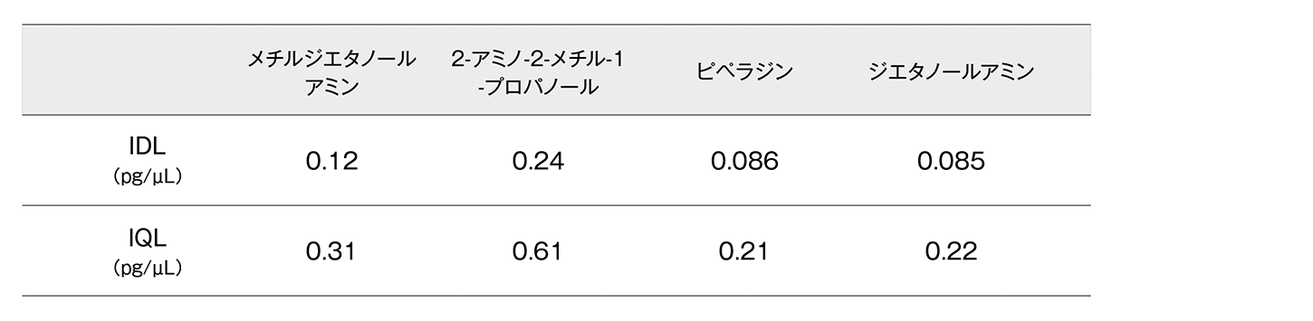 続いて、様々なアミンで検量線を作成し、装置検出下限値(IDL)及び装置定量下限値(IQL)を測定して分析精度を確認しました。検量線の一例が〈図-2〉