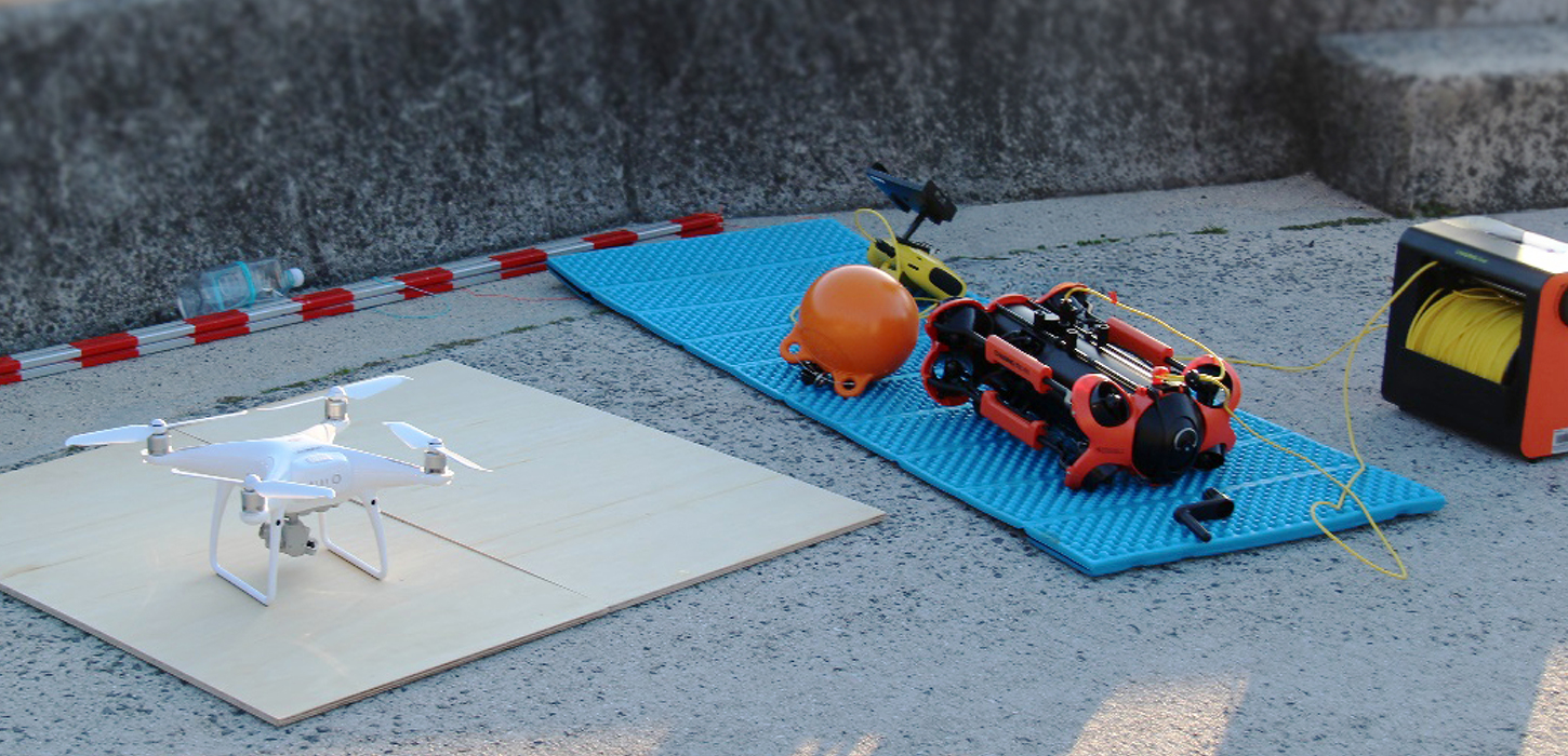 空中ドローンと水中ドローンのそれぞれの特性を活かし、従来の船舶や潜水による非効率な調査手法に代わる新たなアプローチを試験する。