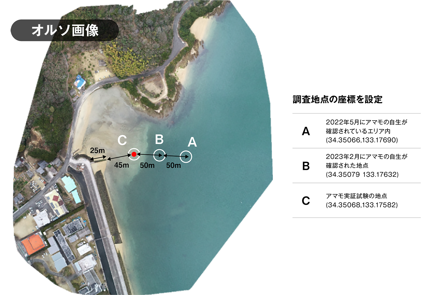 作成したオルソ画像上には、これまでにアマモの自生が確認された地点をプロットし、実証試験に用いる座標を設定しました。