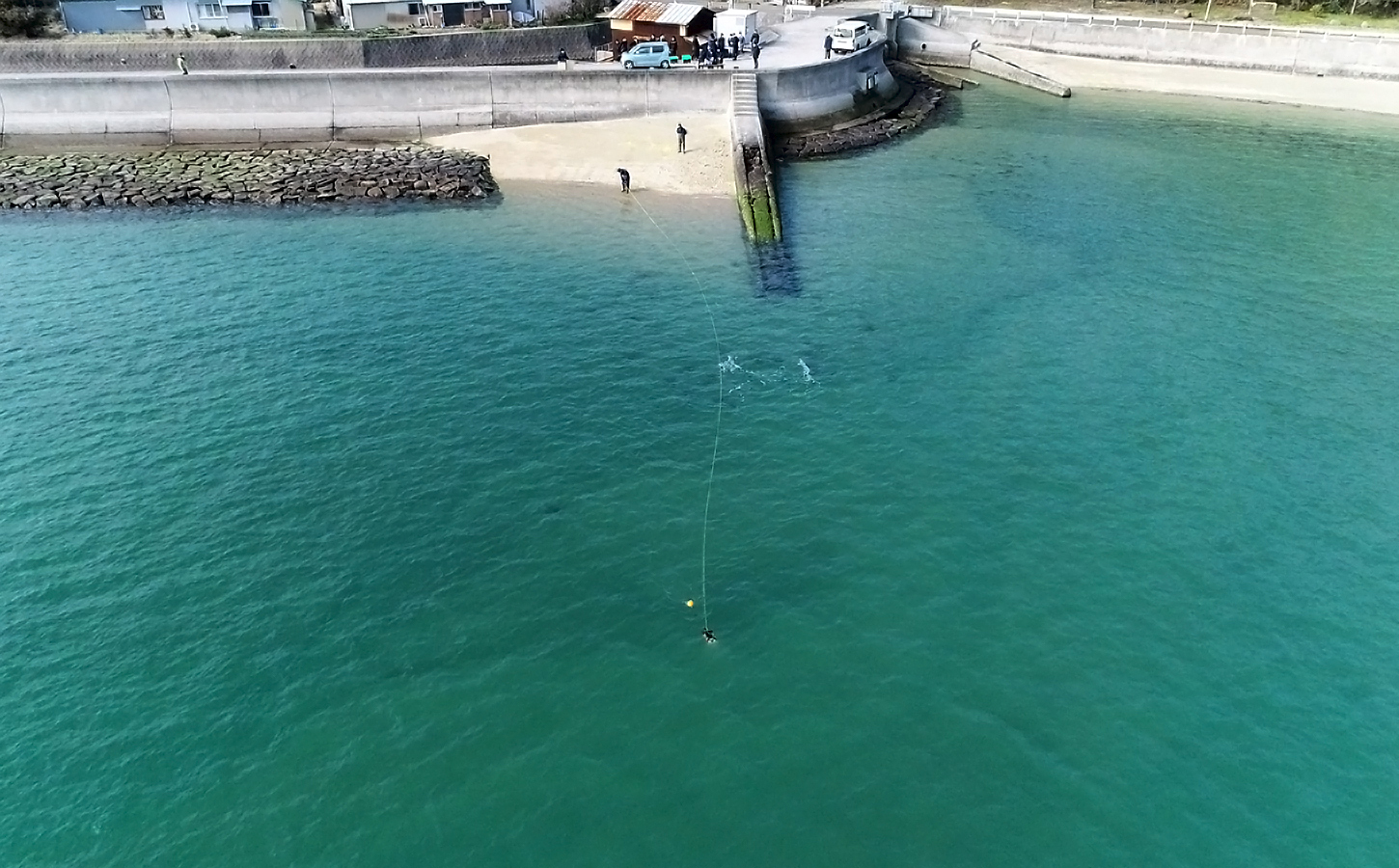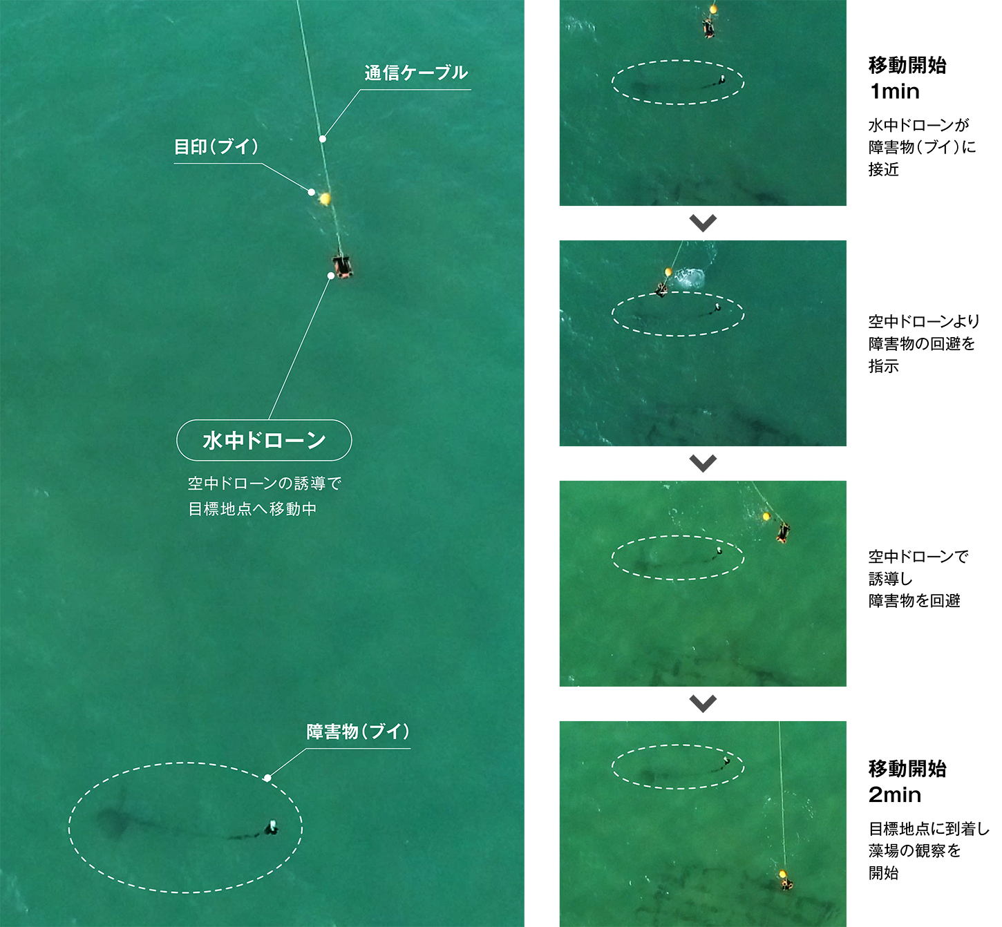 水中ではGPS信号が届かないため、当時一般的に使用されていた水中ドローンには位置情報機能が備わっていませんでした。事前に設定した目標地点へ水中ドローンを到達させるため、空中ドローンによる誘導を行い、障害物を回避しながら移動させることができました。水中ドローンと空中ドローンの操縦士の連携が、正確な誘導を行う上で欠かせませんでした。