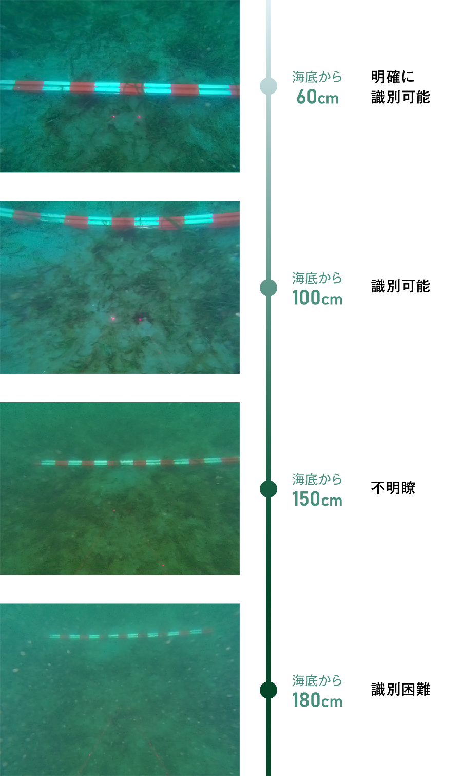 水中ドローンを用いて、海底との距離を変化させながらアマモの撮影を試みました。その結果、透明度の高い海域においては、海底から1m以内の距離で撮影することで、アマモの観察が可能であることが確認されました。