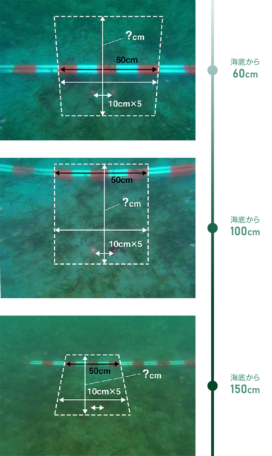 水中画像上で調査区画(コドラート)の設定について検討した結果、レーザースケーラーを用いることで横方向の設定は概ね可能であることが確認されました。一方、縦方向については、機体の傾きが把握できないため正確な設定が困難であることが判明しました。これに対し、真下からの撮影とスケーラーの併用により、縦横方向の寸法を正確に取得できるのではないかと推測されます。
