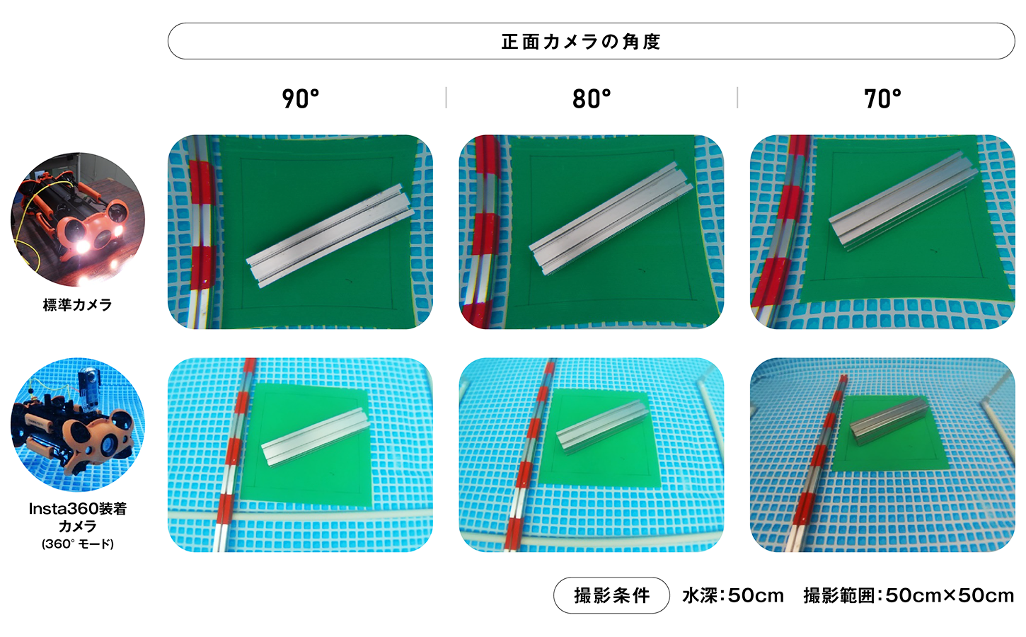 コドラートの検証を通じて、水中カメラを用いた観測に際して、レンズの「ひずみ」が観測結果に影響を及ぼす可能性があることに気づきました。そこで、カメラの特性を把握するため社内で試験を行った結果、機種によって、ひずみの程度に差があることが確認されました。