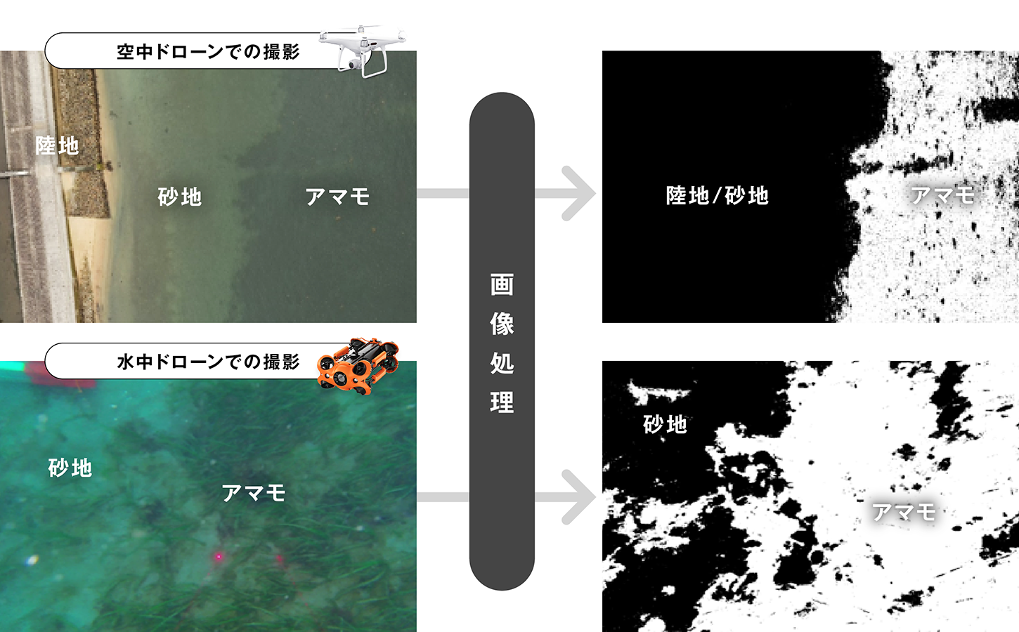 空中ドローンおよび水中ドローンで撮影した画像に対して二値化処理を行い、被度の算出に成功しました。空中ドローンは広範囲の状況把握に適しており、水中ドローンは局所的な状況を高精度で把握することが可能です。なお、二値化処理においては、状況に応じた閾値の設定が重要なポイントとなります。