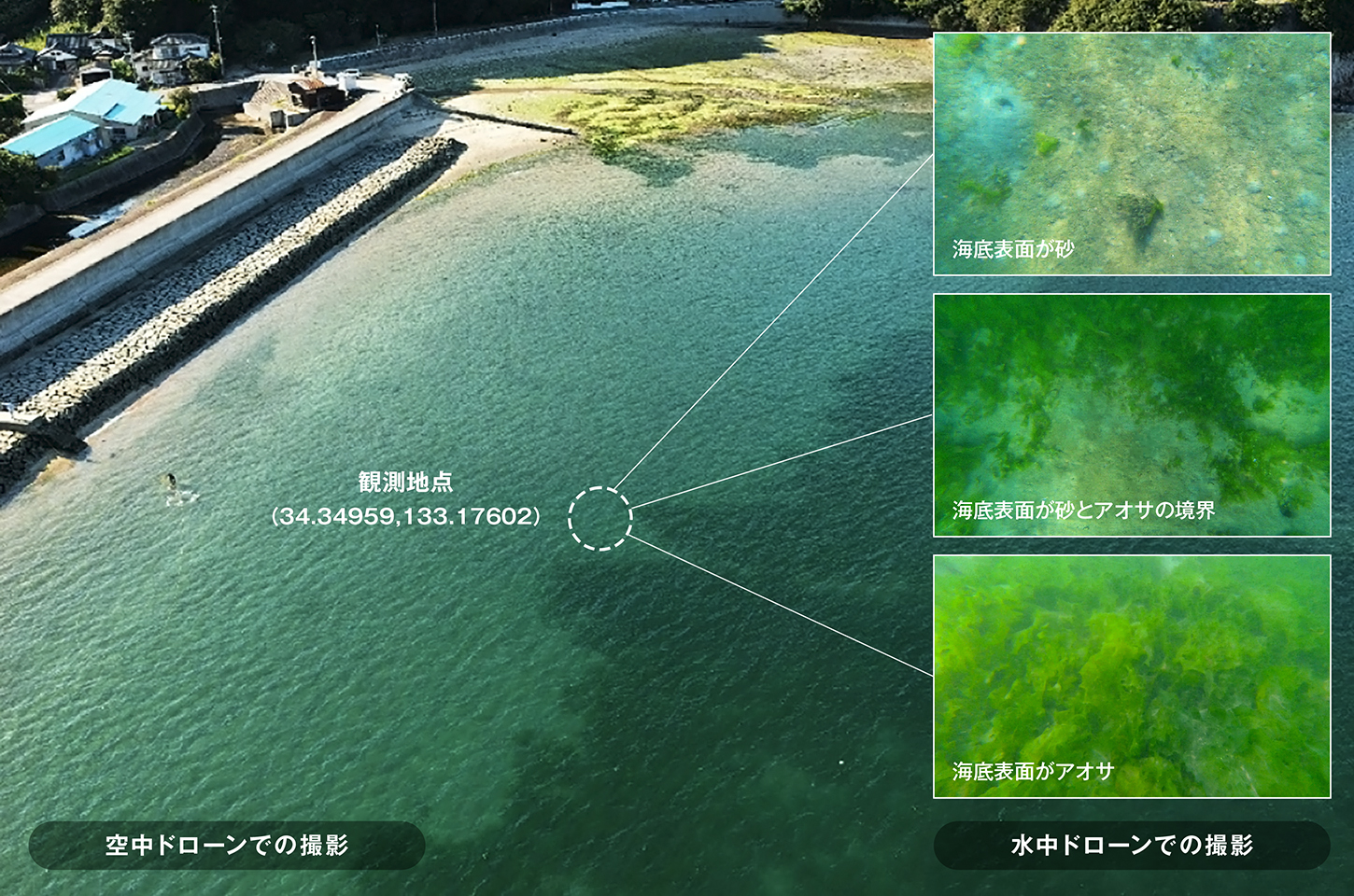 空中ドローンで撮影した藻場と砂地の境界付近について、水中ドローンで撮影した結果を確認したところ、空中で砂地と判定された地点は水中でも砂地であり、藻場と判定された地点も水中で藻場として確認されました。